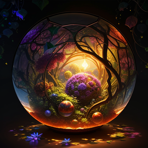 프롬프트: spherical Terrarium, abstract dream, flower, brushes, ivy, foliage, wild, orb, fantasy, complex, gemstone, highly detailed, intricate, elaborate, octane render, 4k HDR, colorful, fractal, black background, eco system, glowing, reflection, crepuscular rays, luminescence
