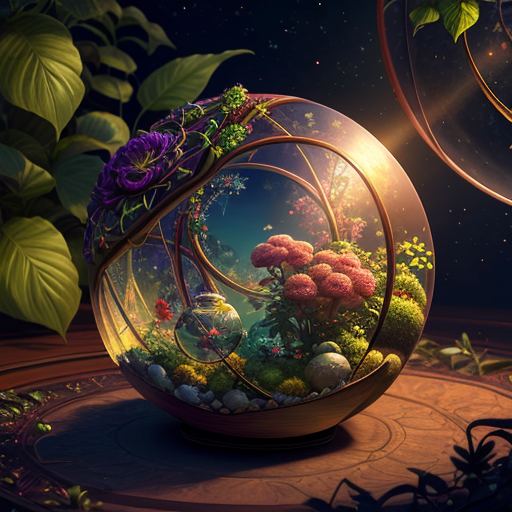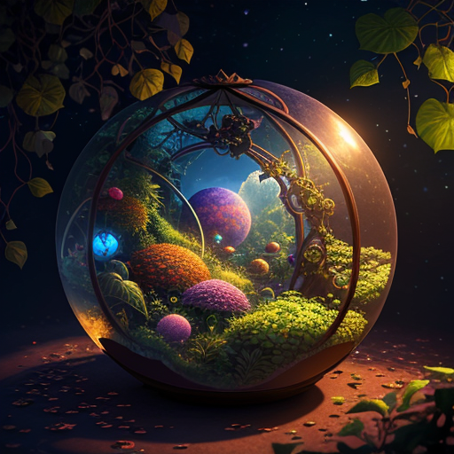 프롬프트: spherical Terrarium, abstract dream, flower, brushes, ivy, foliage, wild, orb, fantasy, complex, gemstone, highly detailed, intricate, elaborate, octane render, 4k HDR, colorful, fractal, black background, eco system, glowing, reflection, crepuscular rays, luminescence