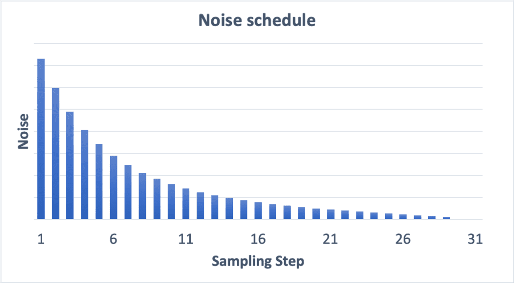 위에서 잡음 제거 프로세스가 진행됨에 따라 이미지가 점차 깨끗해진다는 것을 아셨을 것입니다. 이때 잡음 스케줄은 각 샘플링 단계에서 제거하는 잡음의 수준을 제어합니다. 대부분의 경우 첫 단계에서는 제거되는 잡음 양이 많고, 마지막에 가까워질 수록 줄어듭니다.