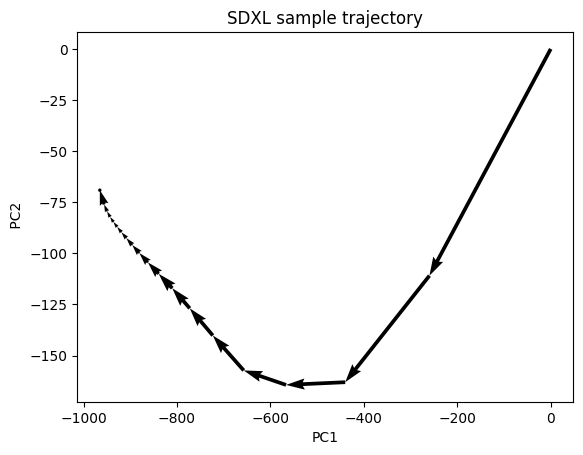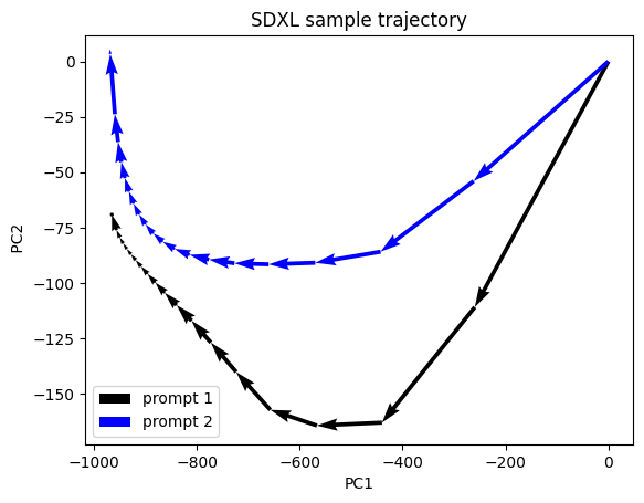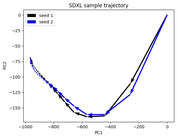 다음은 PCA(Principle Component Analysis, 주성분 분석)을 사용해 디퓨전 프로세스를 2차원 공간에 투영해본 모습입니다.