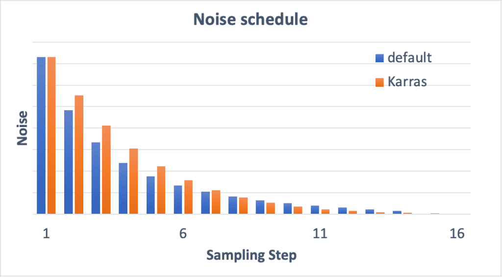 샘플러 이름에 "Karras"가 포함된 것은 Karras 논문에서 추천된 잡음 스케줄을 사용합니다. 자세히 살펴보면, 끝부분에 잡음의 크기가 작은 것을 알 수 있습니다. 논문 저자들에 따르면 이를 통해 이미지의 품질이 향상된다고 합니다.