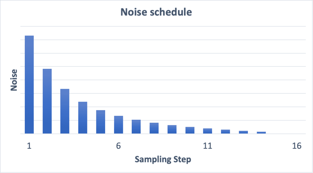 위에서 잡음 제거 프로세스가 진행됨에 따라 이미지가 점차 깨끗해진다는 것을 아셨을 것입니다. 이때 잡음 스케줄은 각 샘플링 단계에서 제거하는 잡음의 수준을 제어합니다. 대부분의 경우 첫 단계에서는 제거되는 잡음 양이 많고, 마지막에 가까워질 수록 줄어듭니다.