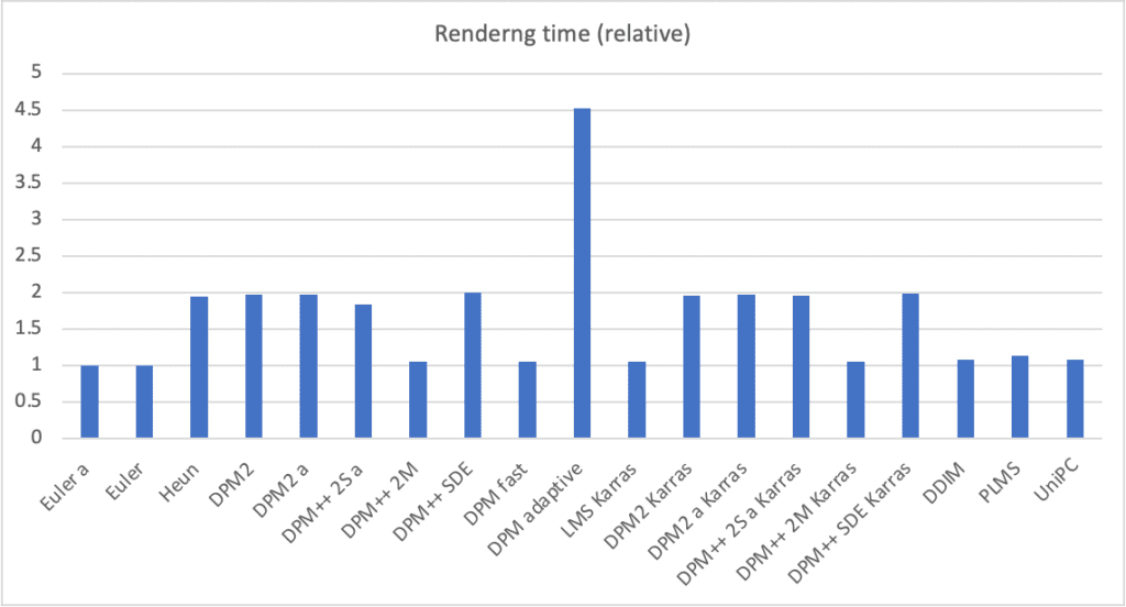 나머지 샘플러들은 거의 2가지 부류로 나누어집니다. 첫번째 그룹은 Euler와 비슷한 속도(1 배)이고, 다른 그룹은 2배의 시간이 걸립니다(2배 시간). 이는 알고리즘의 차수에 따른 결과입니다. 2차 해법은 좀더 정확하지만, 잡음제거 U-Net을 두번 평가하여야 하기 때문에 2배의 시간이 소요됩니다.