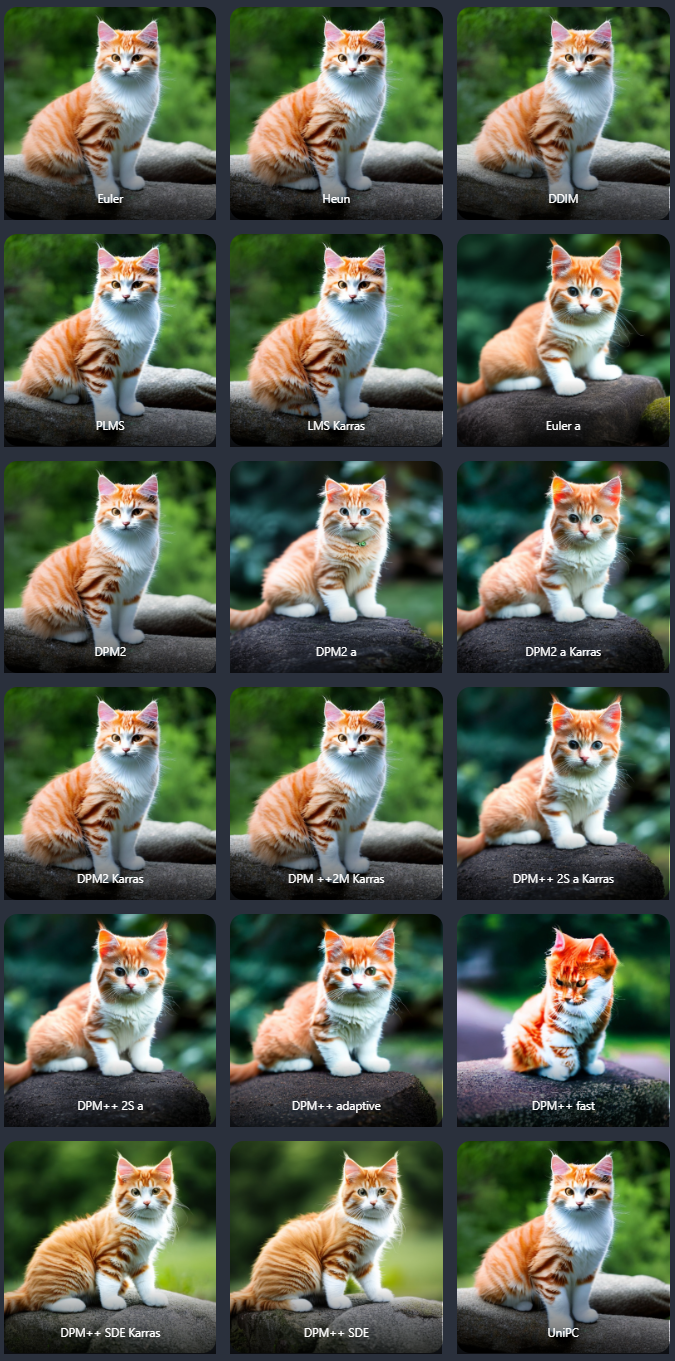 DPM++ fast는 꽤 심하게 나쁜 결과가 만들어졌습니다. 또한 Ancestral 샘플러는 다른 이미지에 대해 수렴하지 않아서 약간 다른 결과가 만들어짐을 알 수 있습니다. 그리고 Ancestral 샘플러는 아기 고양이 이미지로 수렵하는 경향이 있고, 기타 결정론적 샘플러는 성체 고양이로 수렴하는 경향이 있습니다. 이는 생성하는 사람의 선호도에 따를 뿐, 정답은 없습니다.