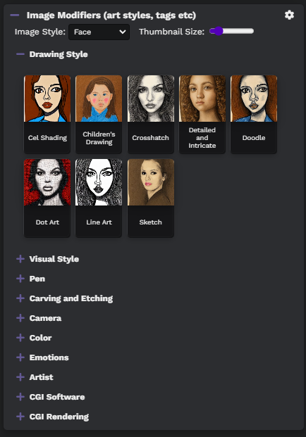 - 톱니바퀴 아이콘(오른쪽 위) : 수식어(Modifier)를 직접 입력 가능. 프롬프트 입력과 마찬가지로, 수식어를 콤마(,)로 분리하여 한줄로 만들 수도 있고, {} () [] | 등의 특수문자도 포함할 수 있습니다.