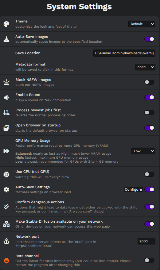 - Metadata format(메타데이터 포맷) : 이미지 생성 설정값 저장 파일 형식(none, txt, json, embed)를 지정합니다.
