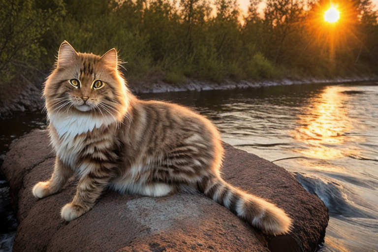프롬프트: National Geographic Wildlife photo of the year, siberian cat on river, evening light, sunset, rim lighting, depth of field