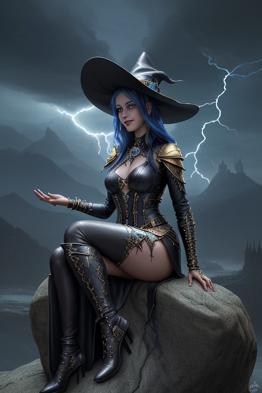 프롬프트: a beautiful and powerful mysterious sorceress, smile, sitting on a rock, lightning magic, hat, detailed leather clothing with gemstones, dress, castle background