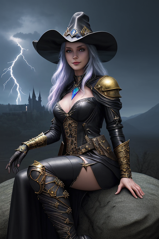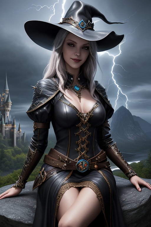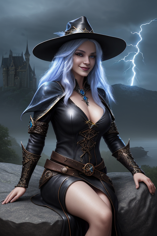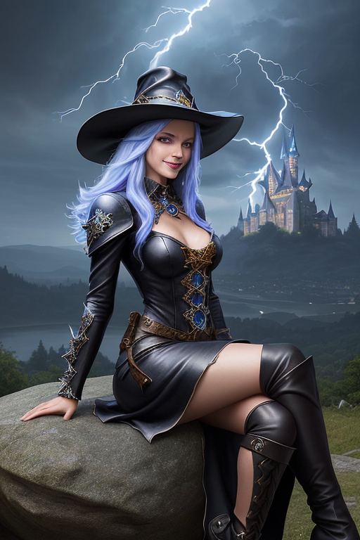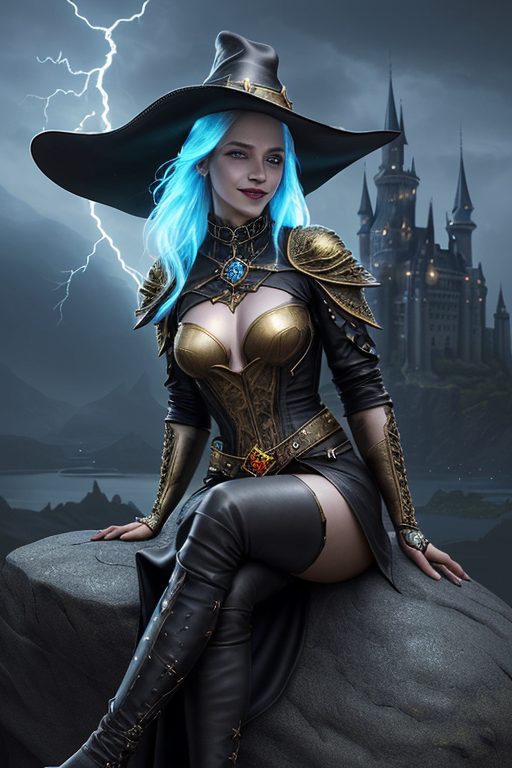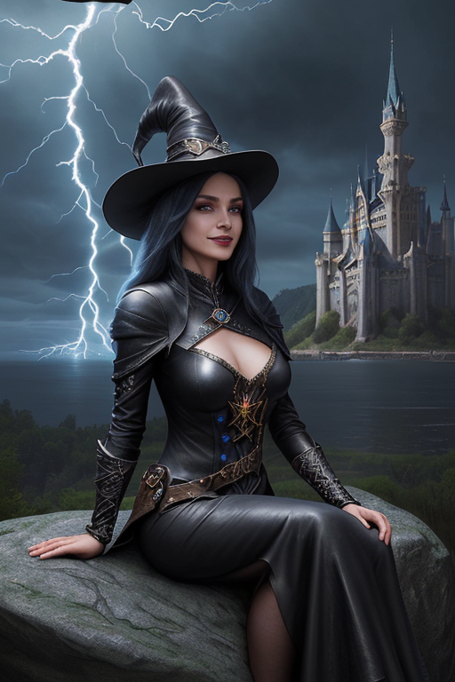 프롬프트: a beautiful and powerful mysterious sorceress, smile, sitting on a rock, lightning magic, hat, detailed leather clothing with gemstones, dress, castle background
