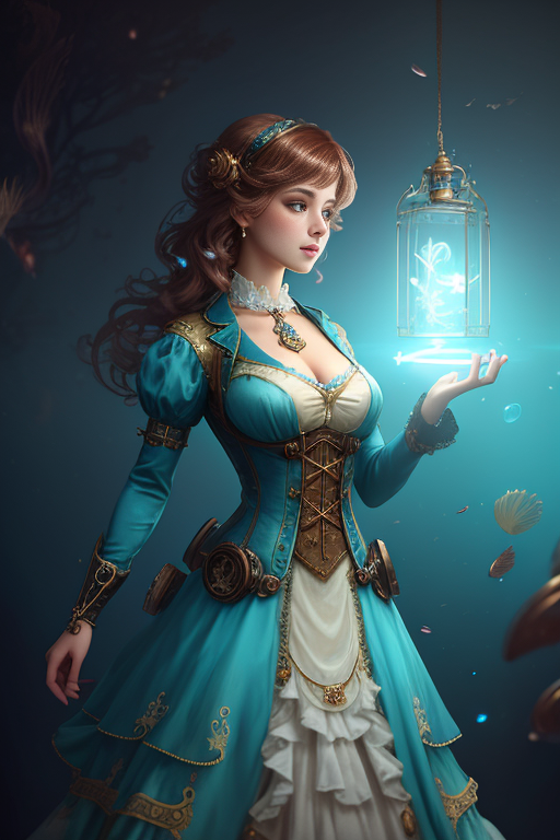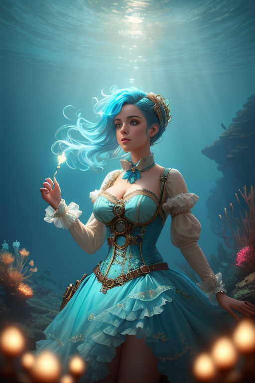 | Underwater steampunk painting of a young woman with light blue dress, hair floating, artstation, 8k, extremely detailed, ornate, cinematic lighting, vivid. | ||