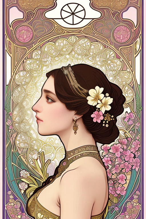 | A young woman adorned with flower motifs in a graphic inspired by the style of Alphonse Mucha. Intricate linework and decorative elements bring the artwork to life, capturing the elegance and grace of the Art Nouveau era (이 프롬프트도 ChatGPT를 활용해 작성했습니다.) | ||