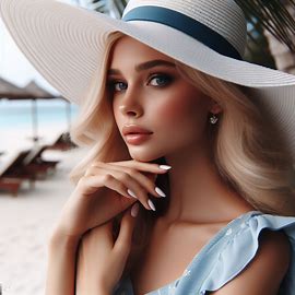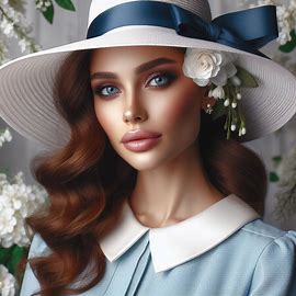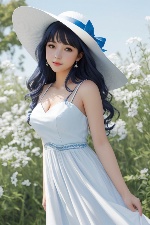 그런데... 직접 해보시면 색이 섞이는 경우가 많습니다. 위의 이미지 들도 모자의 밴드가 청색으로 되어 있는 게 이런 효과 때문입니다. 이런 미묘한 프롬프트 처리는 DALL-E 3가 최고라고 합니다. 아래는 " photo of a woman in white hat and blue dress" 로 그린 결과입니다. 머... 그런데 모자 밴드가 청색이 되는 건 비슷하네요. ㅎㅎ