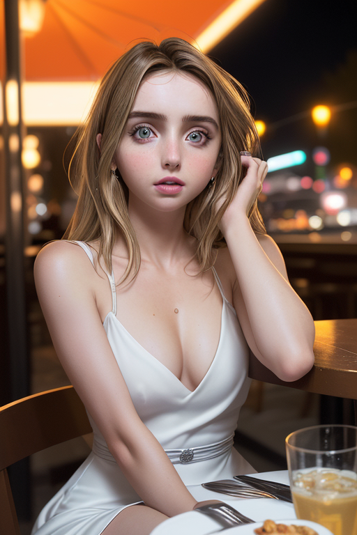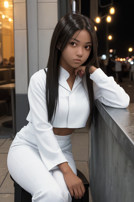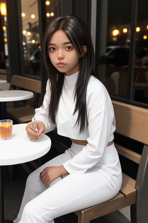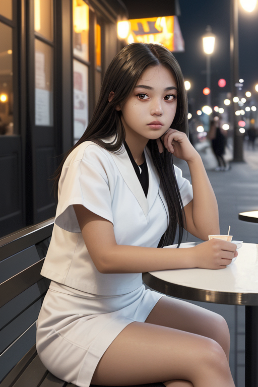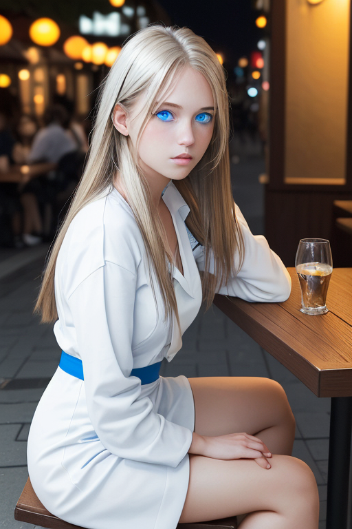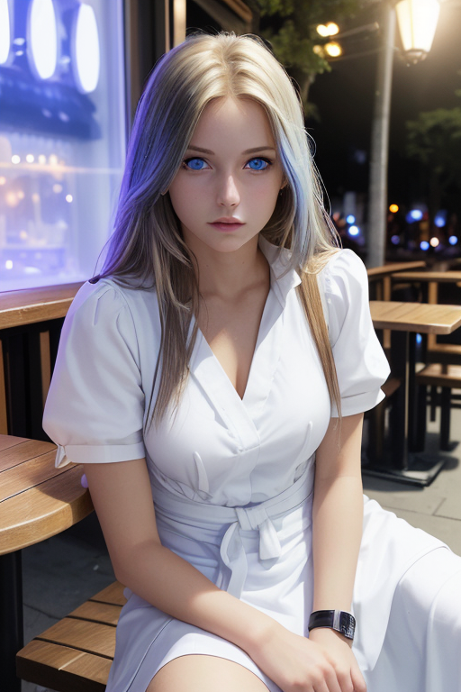프롬프트 : a young female with blue eyes, highlights in hair, sitting outside restaurant, wearing a white outfit, side light
