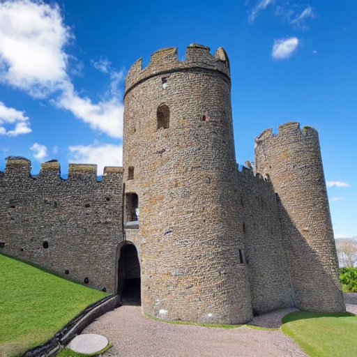 프롬프트: wide angle view of castle, blue sky background