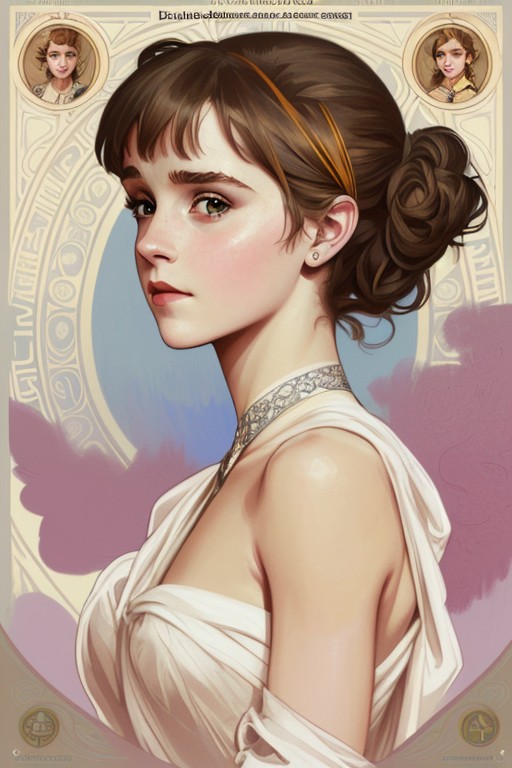 프롬프트: digital painting of [Emma Watson: Audrey Hepburn : 0.6] by Alphonso Mucha
