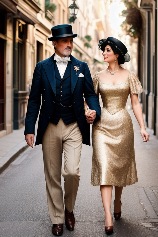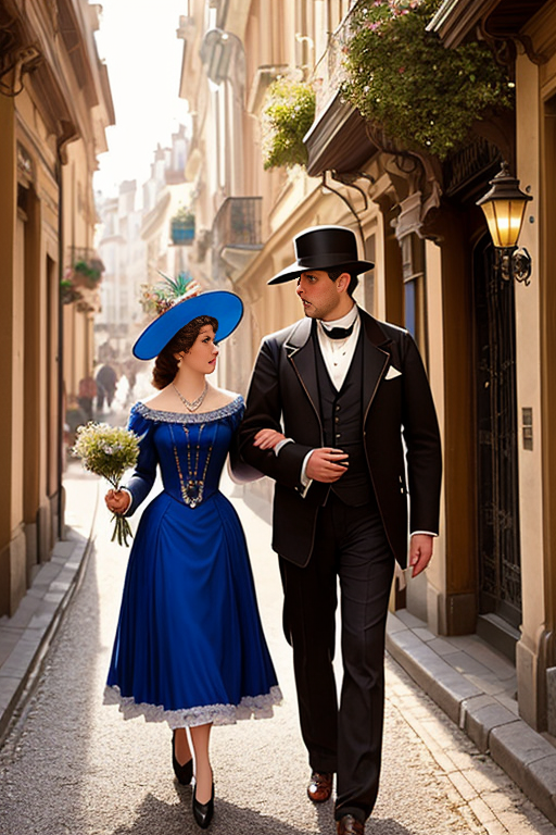 | A 19th-century Brougeois-style couple strolling along an Art Nouveau street, capturing the romantic ambiance of the era. Sunlight casts enchanting shadows on the winding alleys as they don elegant attire and hats, while the photo exudes a retro charm with intricate details reminiscent of a bygone era. (이 프롬프트는 ChatGPT를 활용해 작성했습니다.) | ||