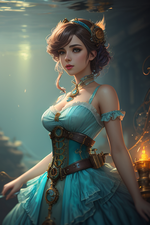 | Underwater steampunk painting of a young woman with light blue dress, hair floating, artstation, 8k, extremely detailed, ornate, cinematic lighting, vivid. | ||