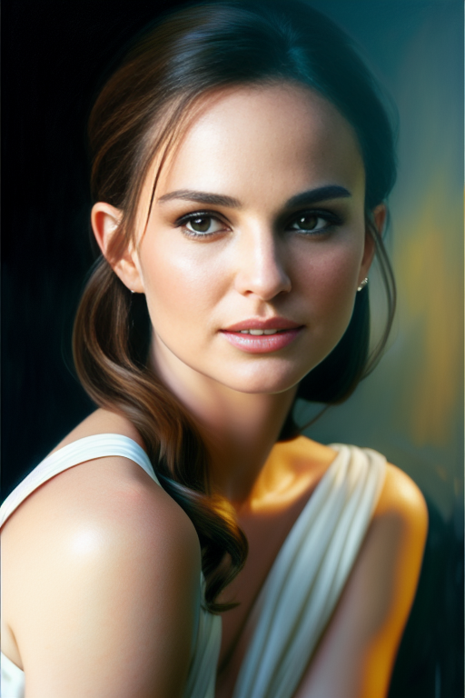 프롬프트: photo realistic portrait of [Emma Watson: Natalie Portman: 0.6], exquisitely rendered, stunning artistry, grace, enigmatic aura, rim lighting, Meticulous attention, masterful brushwork