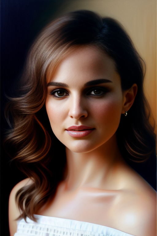 프롬프트: photo realistic portrait of [Emma Watson: Natalie Portman: 0.6], exquisitely rendered, stunning artistry, grace, enigmatic aura, rim lighting, Meticulous attention, masterful brushwork