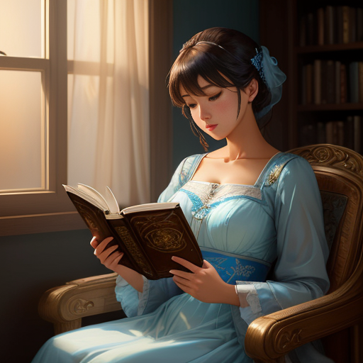 프롬프트: Digital painting of a young woman with light blue dress sitting next to a wooden window reading a book, by Stanley Artgerm Lau, artstation, 8k, extremely detailed, ornate, cinematic lighting, vivid