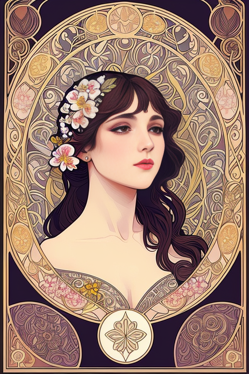 | A young woman adorned with flower motifs in a graphic inspired by the style of Alphonse Mucha. Intricate linework and decorative elements bring the artwork to life, capturing the elegance and grace of the Art Nouveau era (이 프롬프트도 ChatGPT를 활용해 작성했습니다.) | ||