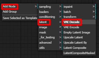 다음으로 VAE Decode 노드를 하나 더 추가합니다. 빈 캔버스에서 우클릭 Add Node -> latent -> VAE Decode를 선택하면 됩니다. 그 다음 Add Node -> image -> Preview image를 선택해 Preview 노드도 하나 추가해 줍니다.