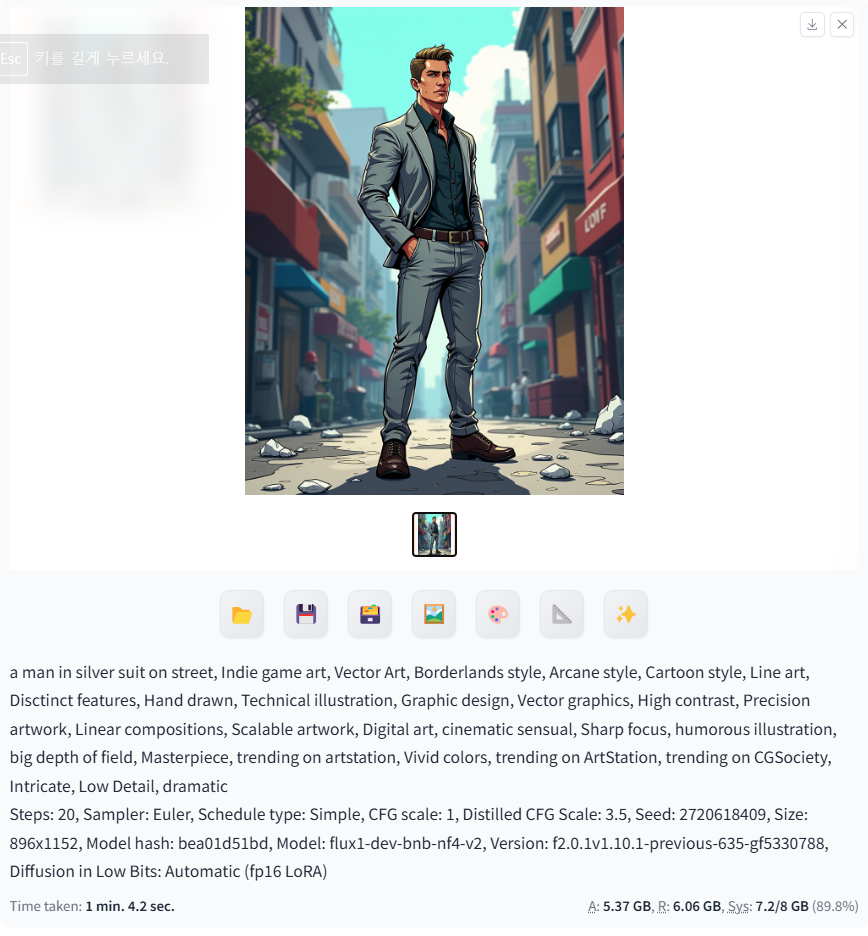 생성된 이미지 아래에는 실제로 적용된 프롬프트가 나타납니다. 보시는 것처럼 처음 입력한 프롬프트보다 10배 이상 길게 늘어났음을 알 수 있습니다.