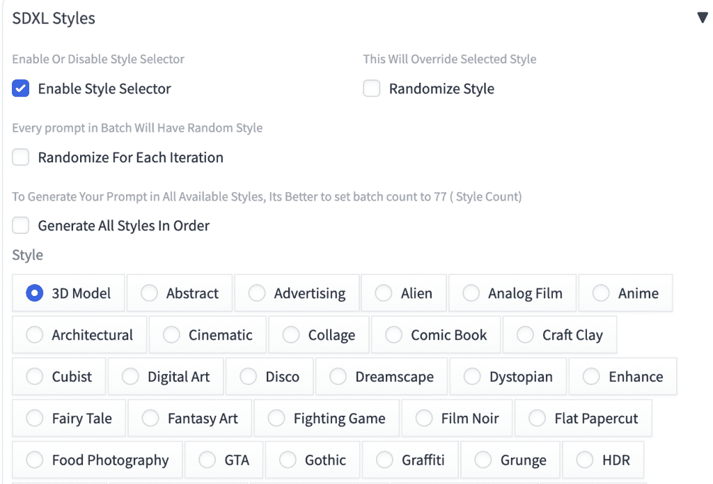 이제 txt2img 페이지 아래쪽에 [SDXL Styles]라는 영역이 새로 추가됩니다. 이 영역을 확장하고 먼저 [Enable Style Selector] 체크박스를 켜줍니다.