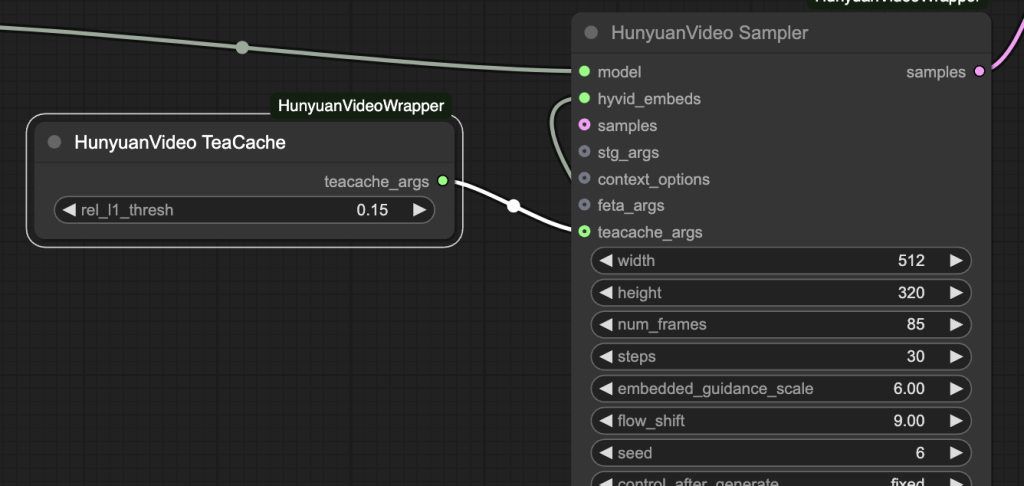 ComfyUI-HunyuanVideoWrapper 커스톰 노드를 사용하면, TeaCache가 Hunyuan Video를 기본적으로 지원합니다. 아래와 같이 [HunyuanVideo TeaCache] 노드를 [HunyuanVideo Sampler]노드와 연결해주기만 하면 됩니다.