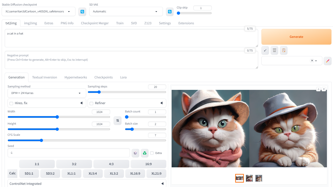Text-to-Image 는 AI 이미지 생성기의 여러가지 기능중 가장 기본적인 기능입니다. AUTOMATIC1111을 사용할 경우, txt2img 페이지에 들어가면 Text-to-Image 기능을 사용할 수 있습니다. 아래는 "a cat in a hat"이라는 프롬프트를 입력하여 생성한 예입니다.