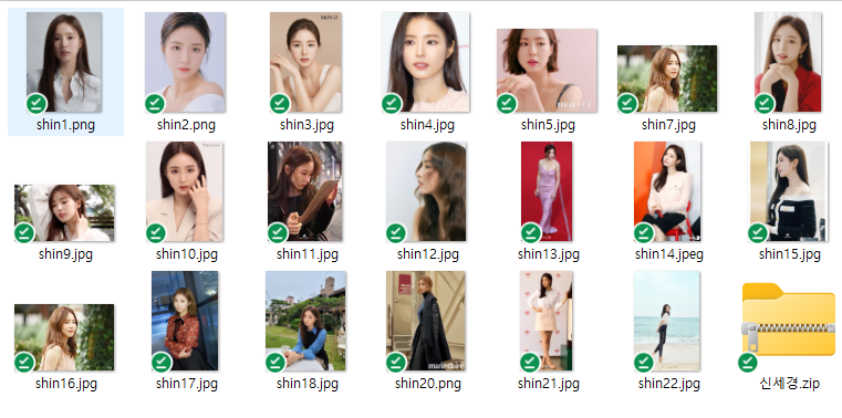 그 다음, 이 모든 이미지를 단일 .zip 파일로 압축합니다. 아래는 배우 신세경님을 포현하는 LoRA를 만들기 위한 이미지입니다.