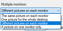 설정화면 오른쪽 아래에는 멀티 모니터를 위한 설정이 있습니다. 아래 그림처럼 여러 모니터에 동일한 그림이 나타나는 방식, 하나의 사진을 여러 모니터에 연속되게 확대하는 방식, 각각의 모니터에 다른 이미지가 나오게 하는 방식 등을 지원합니다.