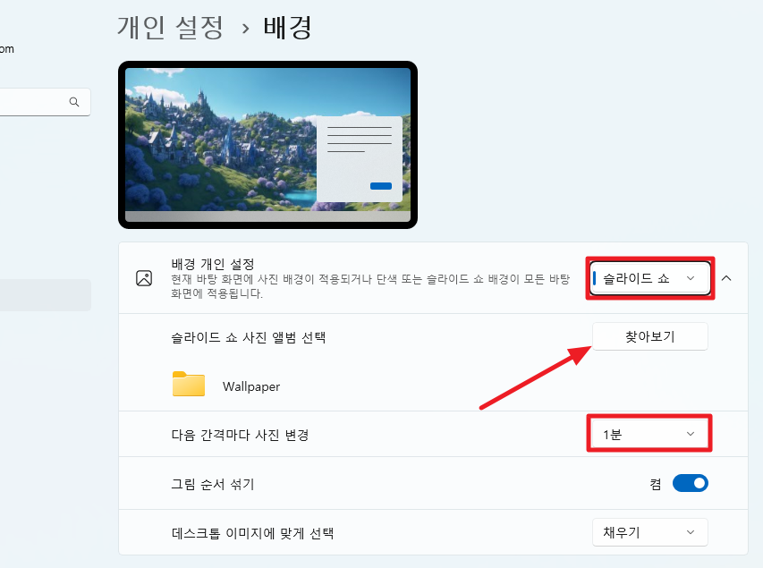 이걸 누르면 아래와 같이 개인 설정화면이 나타나는데, 여기에서 아래와 같이 "배경 개인 설정"에서 [슬라이드 쇼]로 설정하고 "찾아보기"를 눌러 이미지가 저장된 폴더를 지정해주시면 됩니다.