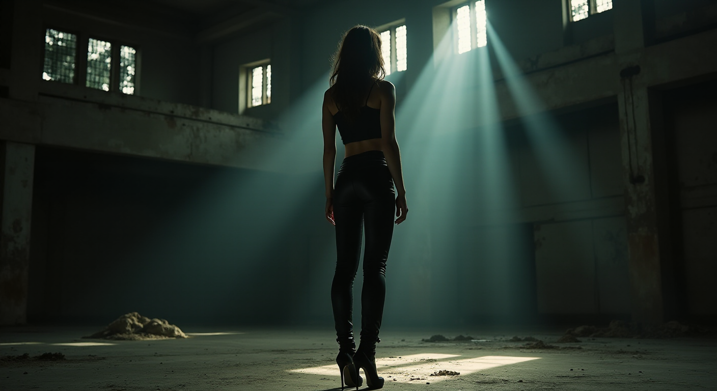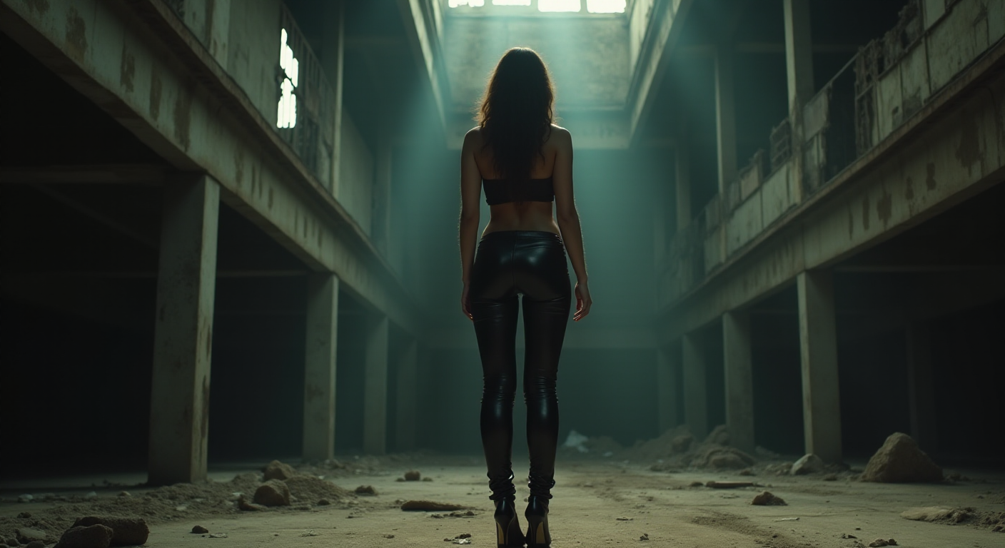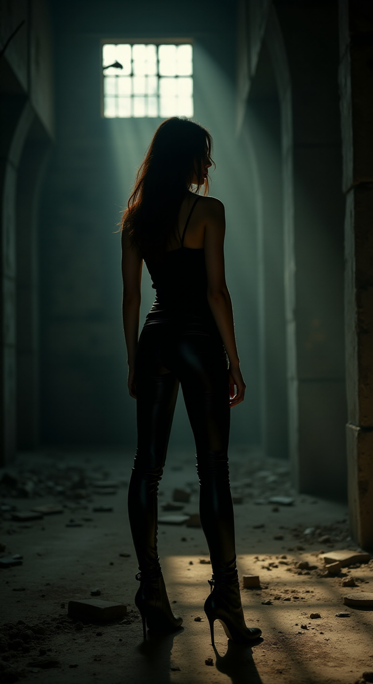 프롬프트: A cinematic film still dramatic backlit photograph of a confident brunette slim woman in a sleek, tight-fitting outfit, leather pant, high heel, in a vast, decaying interior of an abandoned factory. The dimly lit scene, shattered windows, gaps in the crumbling walls, casting intricate patterns of shadows, rusted metal and worn concrete surfaces. hair light, rim lighting, enhancing the contours of her figure against the shadowy backdrop. The atmosphere is moody and mysterious, evoking a sense of resilience and intrigue amidst the desolate environment. <lora:aidmaFLUXpro1.1:0.5>