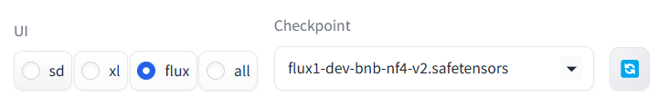 SD Forge를 실행하고, UI에서 flux를 선택하고 체크포인트 드롭다운에서 flux1-dev-bnb-nf4-v2 를 선택합니다.