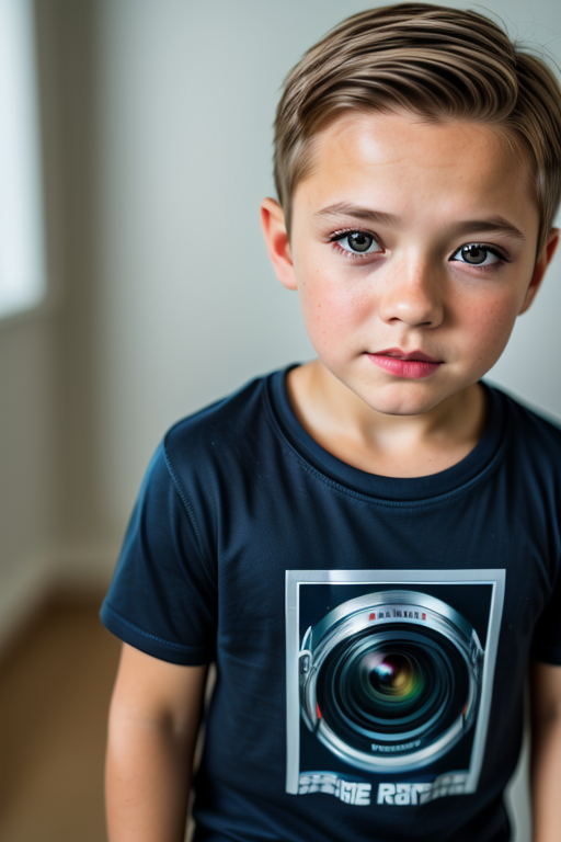 프롬프트: 2 year old boy, t-shirt, rim lighting, side lighting, looking at the camera, dslr, ultra quality, sharp focus, tack sharp, dof, film grain, Fujifilm XT3, crystal clear, 8K UHD, highly detailed glossy eyes, high detailed skin, skin pores