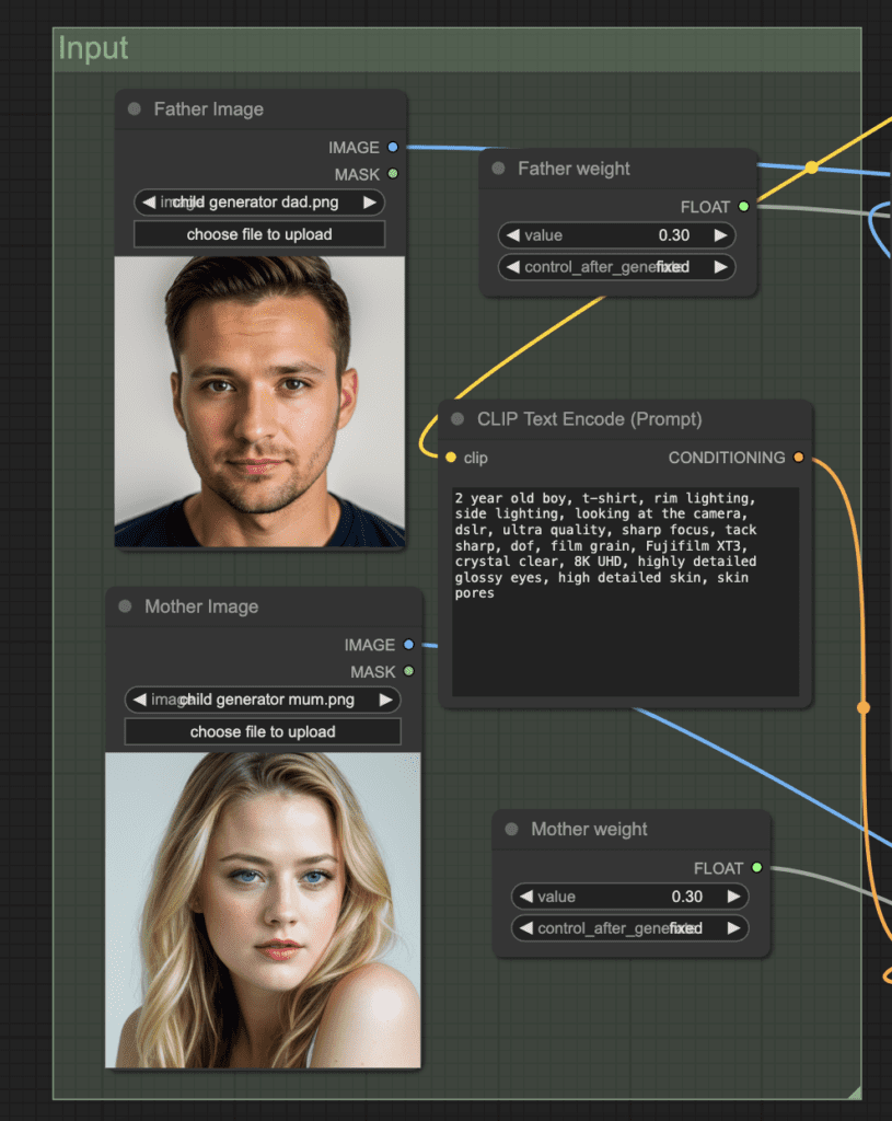 이 글에서는 엄마 아빠의 얼굴을 사용해서 자식의 얼굴을 생성하는 워크플로를 소개합니다. 아래는 그 예입니다.