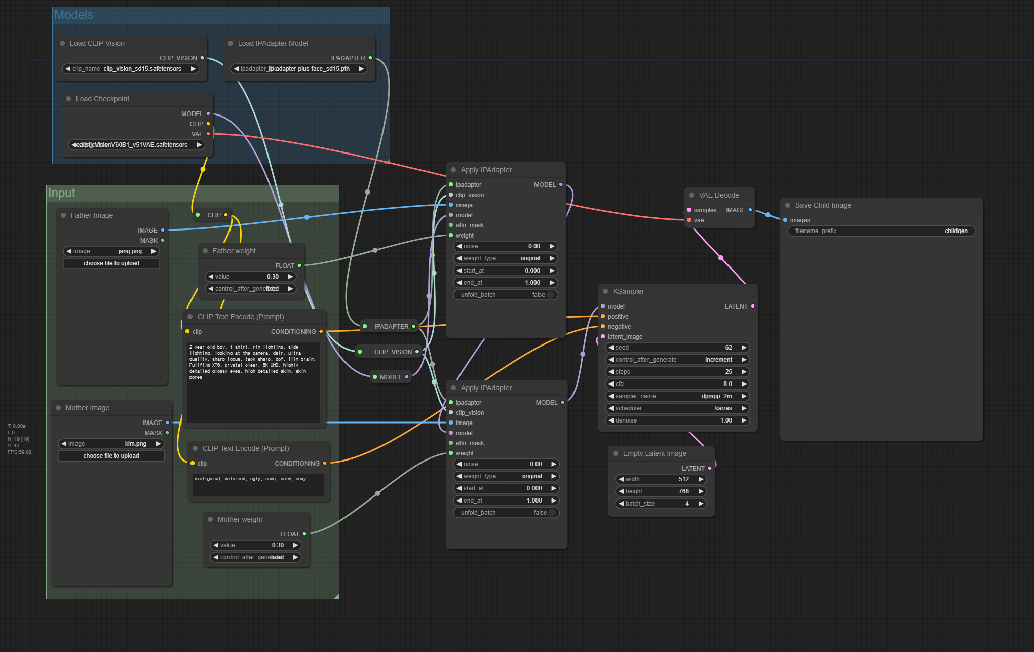 이 워크플로에서는 IP-adapter를 사용합니다. IP-adapter는 이미지를 프롬프트로 사용하는, 특수한 형태의 콘트롤넷으로, 얼굴을 복사하도록 학습되어 있습니다. 즉, 넣어준 이미지와 비슷한 얼굴을 생성하는데 사용합니다. 여기에서는 엄마 아빠 얼굴에 대해 각각 IP-adapter를 적용합니다.