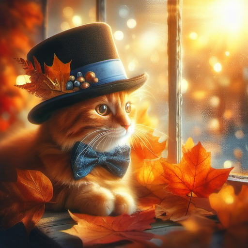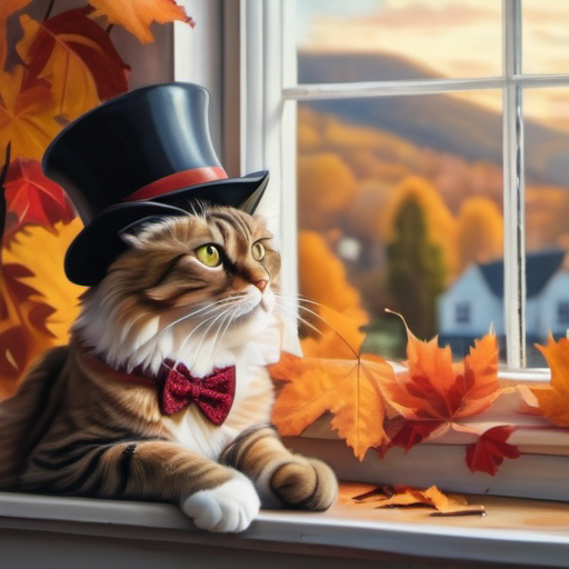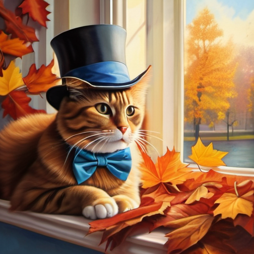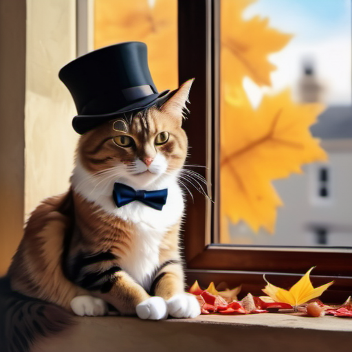 이렇게 분석했더니 "a cat wearing a top hat and bow tie sitting on a window sill with autumn leaves around it, Chris LaBrooy, autumn, a photorealistic painting, fantasy art" 로 나오네요.