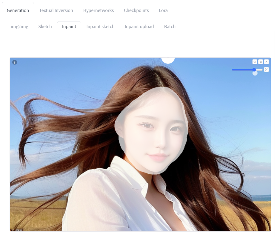 하지만, 사용할 때 약간 주의할 점이 있습니다. 아래와 같이 이미지 중에서 얼굴만 다른 사람으로 바꿔보겠습니다. 인페인트는 img2img 페이지에 들어가서 [Generation]-[inpaint] 탭에 들어가면 사용할 수 있습니다.