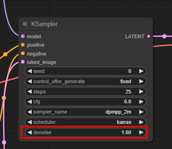 ComfyUI에서도 잡음 제거 강도의 효과는 AUTOMATIC1111과 동일합니다. 잡음제거 강도는 아래 그림과 같이 KSampler 노드에서 변경할 수 있습니다.