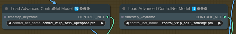 이 워크플로에서는 OpenPose ControlNet 모델과 Soft Edge ControlNet 모델을 사용합니다. 다운로드 받아서 ComfyUI\models\controlnet 폴더에 넣어줍니다. (AUTOMATIC1111과 모델을 공유할 경우 이 글을 보세요) 그 다음 화면을 새로고침(F5)하고 각각 [Load Advanced ControlNet Model] 노드에서 선택합니다.