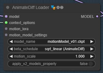 AnimateDiff 모델에서는 추가로 Motion Model v0.1 모듈을 다운로드 받아 ComfyUI\custom_nodes\ComfyUI-AnimateDiff-evolved\models에 넣어줍니다. 그 다음 화면을 새로고침(F5)하고 각각 [AnimateDiff Loader] 노드에서 선택합니다.