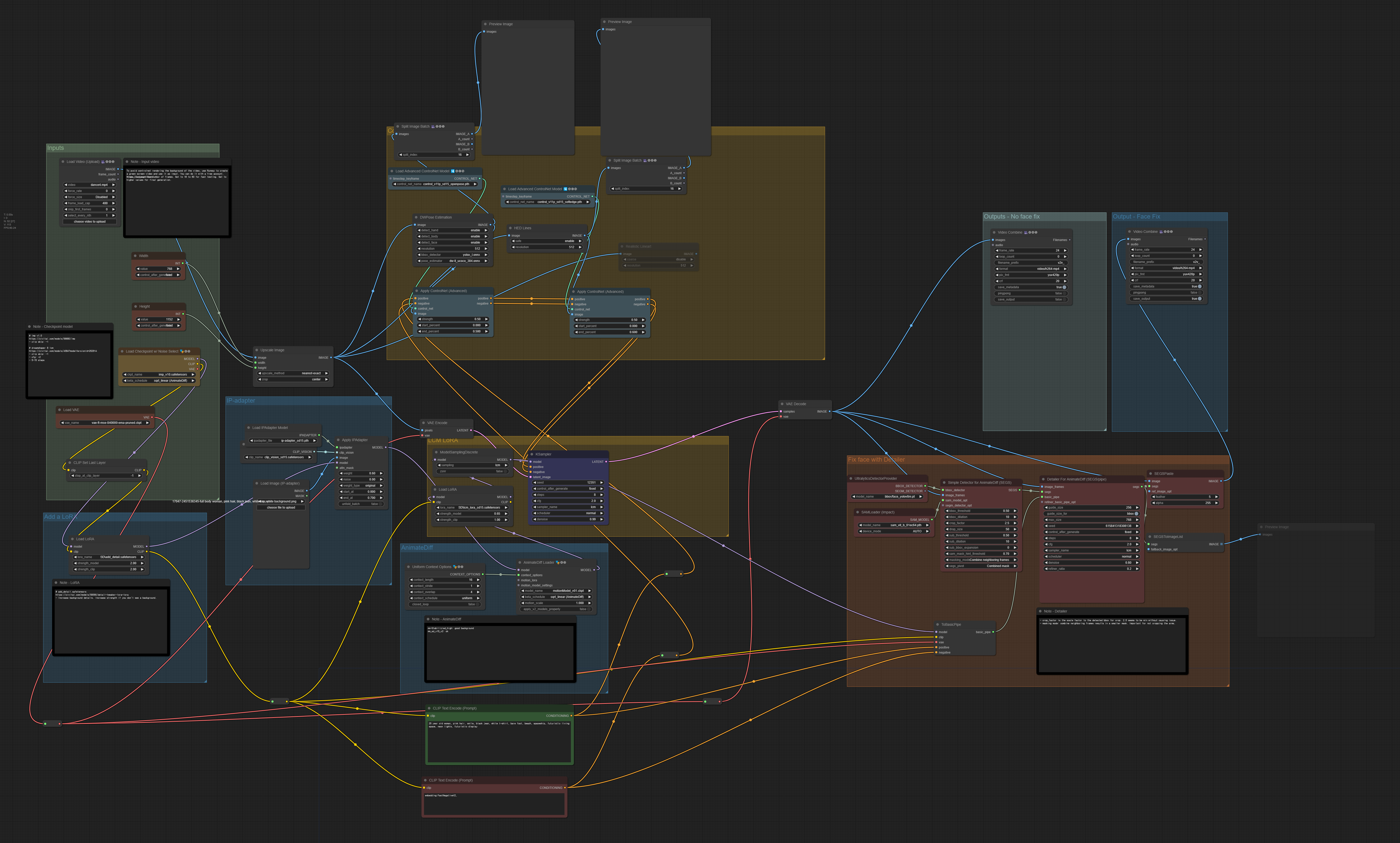 - Detailer(ComfyUI의 ADetailer) - 얼굴을 수정합니다(AnimateDiff와 함께 사용해서 일관성을 유지합니다)