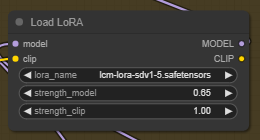마지막으로 LCM LoRA를 다운로드 받아 ComfyUI\models\loras에 넣어줍니다. 가능하면 lcm-lora-sd15.safetentors 로 이름을 변경해줍니다. (AUTOMATIC1111과 모델을 공유할 경우 이 글을 보세요) 그 다음 화면을 새로고침(F5)하고 각각 [Load LoRA] 노드에서 선택합니다.