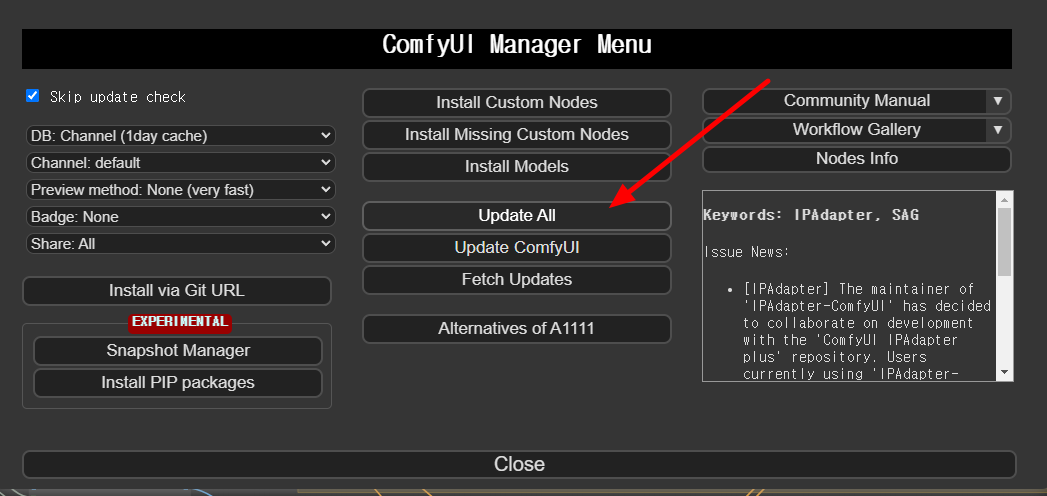저의 경우엔 매번 ComfyUI를 새로 시작할 때마다 ComfyUI Manager를 실행하고 [Update All] 버튼을 눌러주고 있습니다.