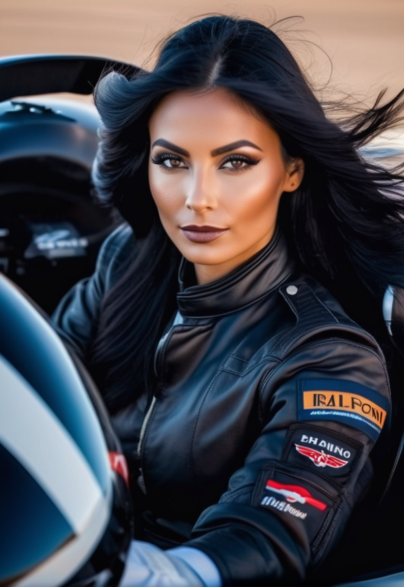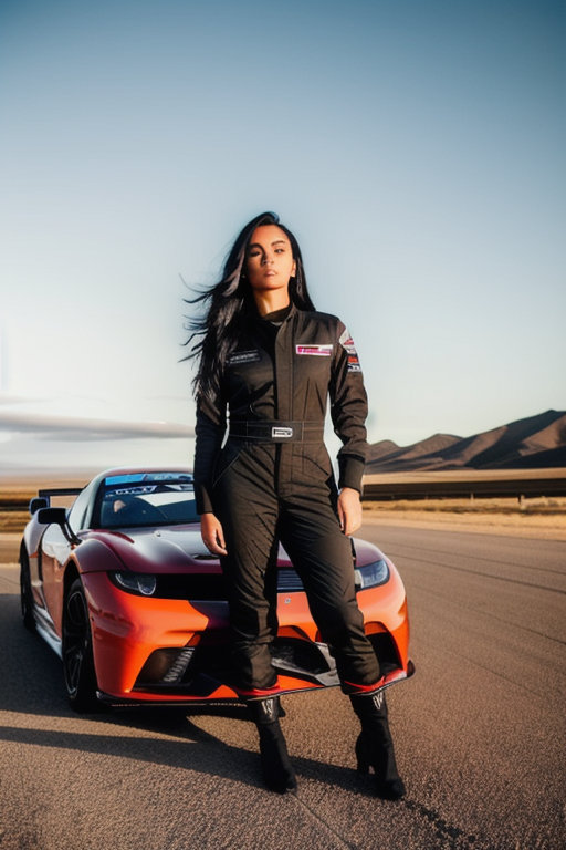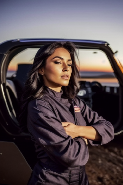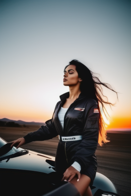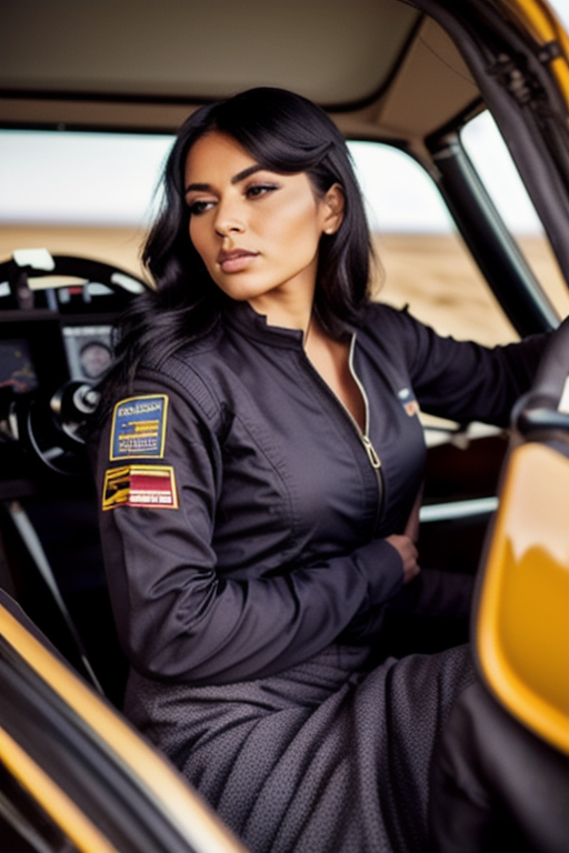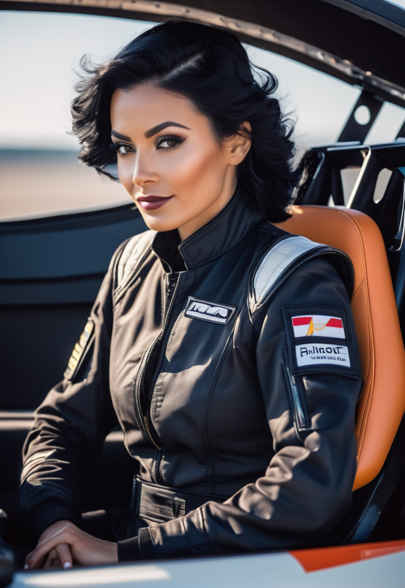 프롬프트 : photo of a ino woman in a race car with black hair and a black pilot outfit,morning time, dessert