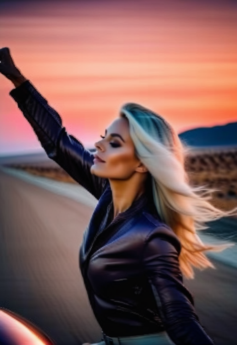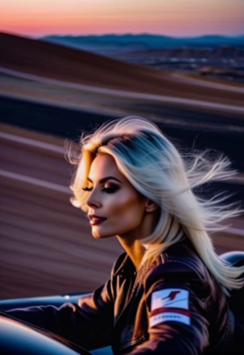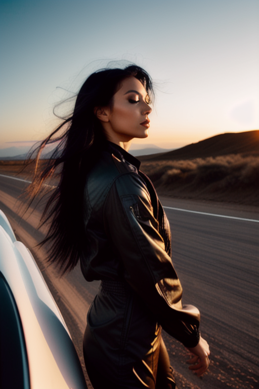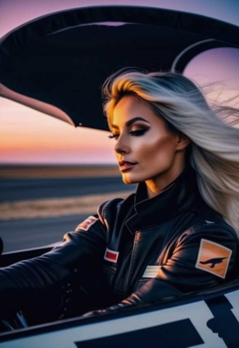 프롬프트 : photo of a ino woman in a race car with black hair and a black pilot outfit,morning time, dessert