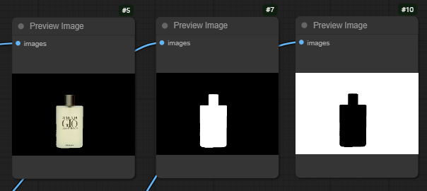 이 워크플로에서는 프롬프트를 사용하여 자동적으로 마스크를 생성할 수 있습니다. 예를 들어, 아래의 예에서 "bottle"이라고 프롬프트를 입력하면 마스크와 역 마스크를 얻을 수 있습니다.