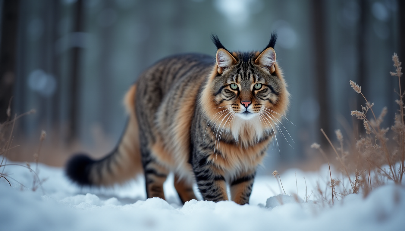 프롬프트: Photo of a siberian cat in russian forest, national geographic winner, photo of the year, bokeh, winter